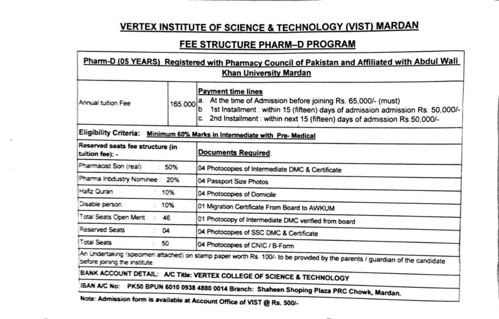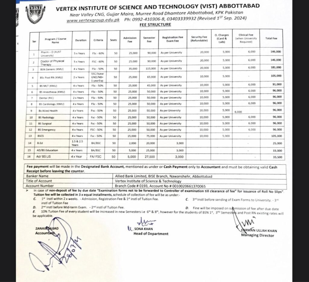 Sr.No. | COURSE NAME | ADMISSION FORM FEE | TUITION FEE | SECURITY | TOTAL FEE (PKR) |